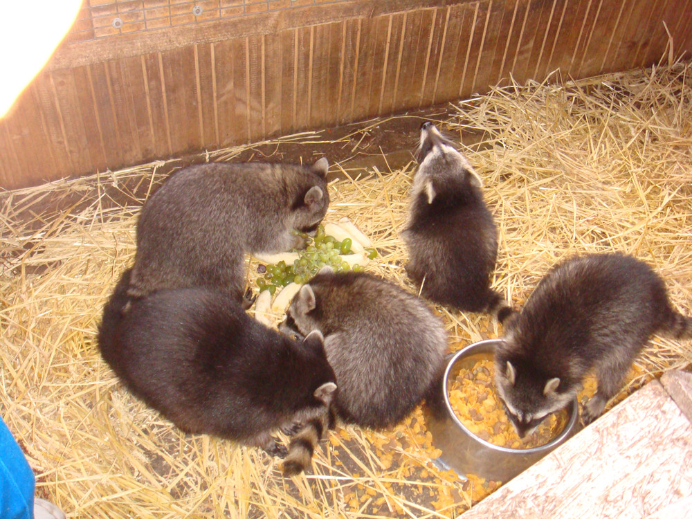 Alle Waschbären bis auf die zwölf die gegenwärtig bei uns leben haben ein neues zu Hause gefunden. Entweder in Zoos oder in privater artgerechter Tierhaltung. Unsere 12 Waschbären sind in 5 Gehegen untergebracht und alle Waschbären sind sehr menschenbezogen und zahm. Deswegen waren Sie schon mehrfach TV Stars.